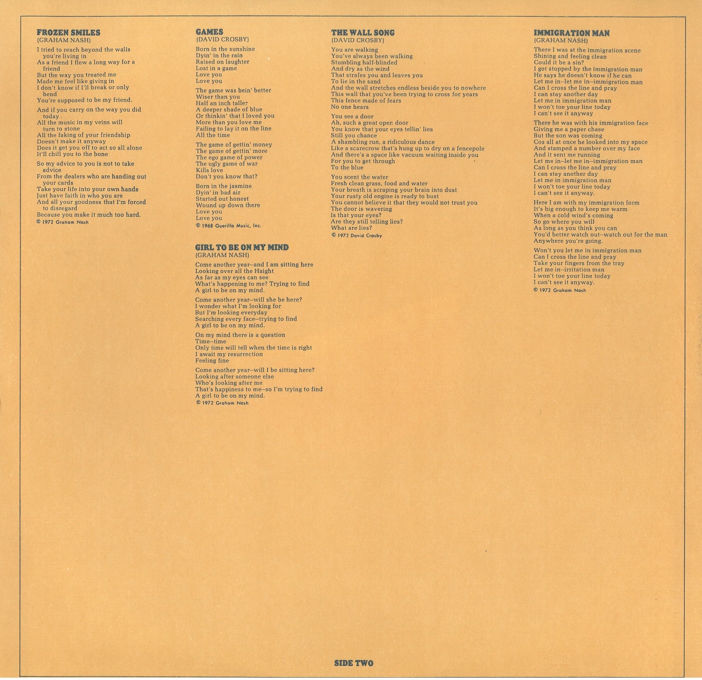 Written-By – David Crosby (tracks: A2, A5 to A6, B2, B4), Graham Nash (tracks: A1, A3 to A4, B1, B3, B5)