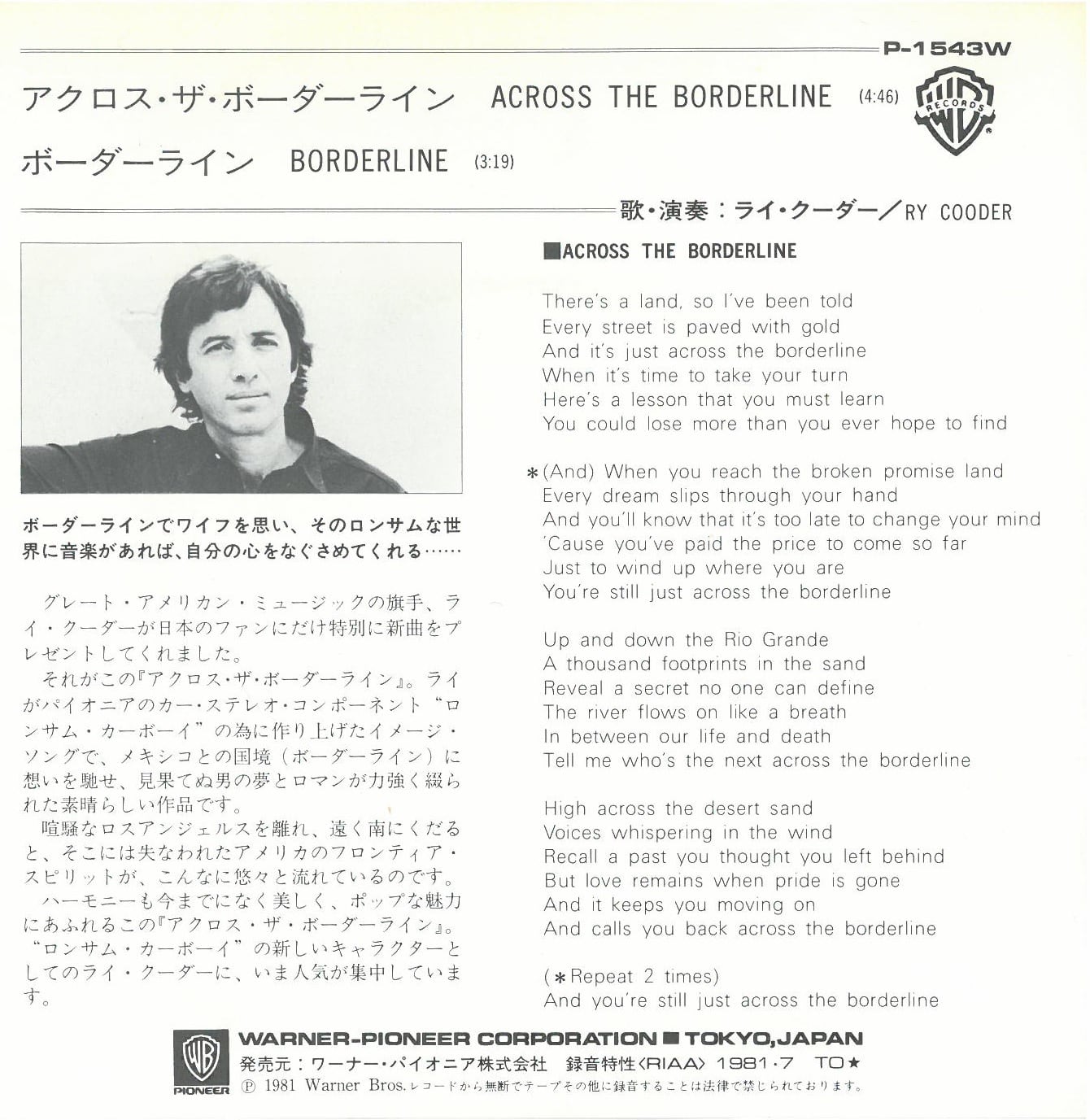 RY COODER / ACROSS THE BORDERLINE (EP) 日本盤