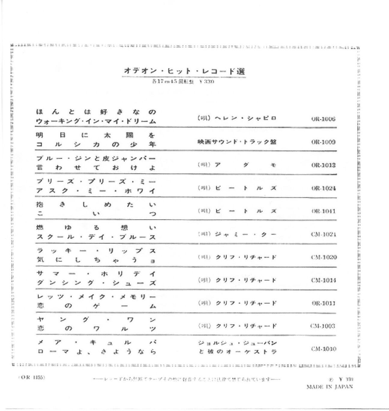 EP (日本盤) 7インチシングル MONO OR-1155 東芝音楽工業株式会社 1965年
