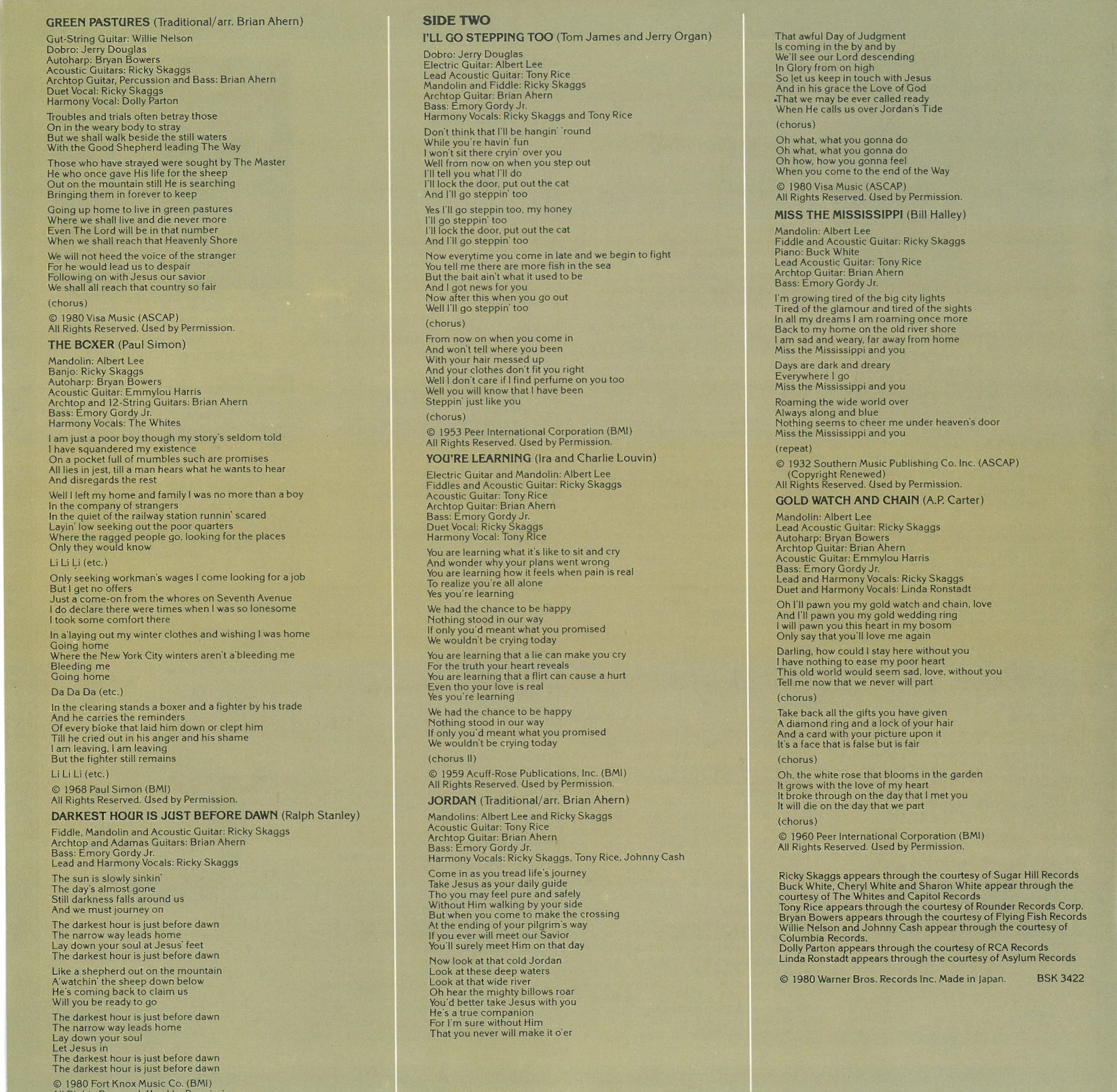 Backing Vocals [Harmony] – Ricky Skaggs (曲: A2, A5, B3, B5), Tony Rice (曲: B1 to B3)