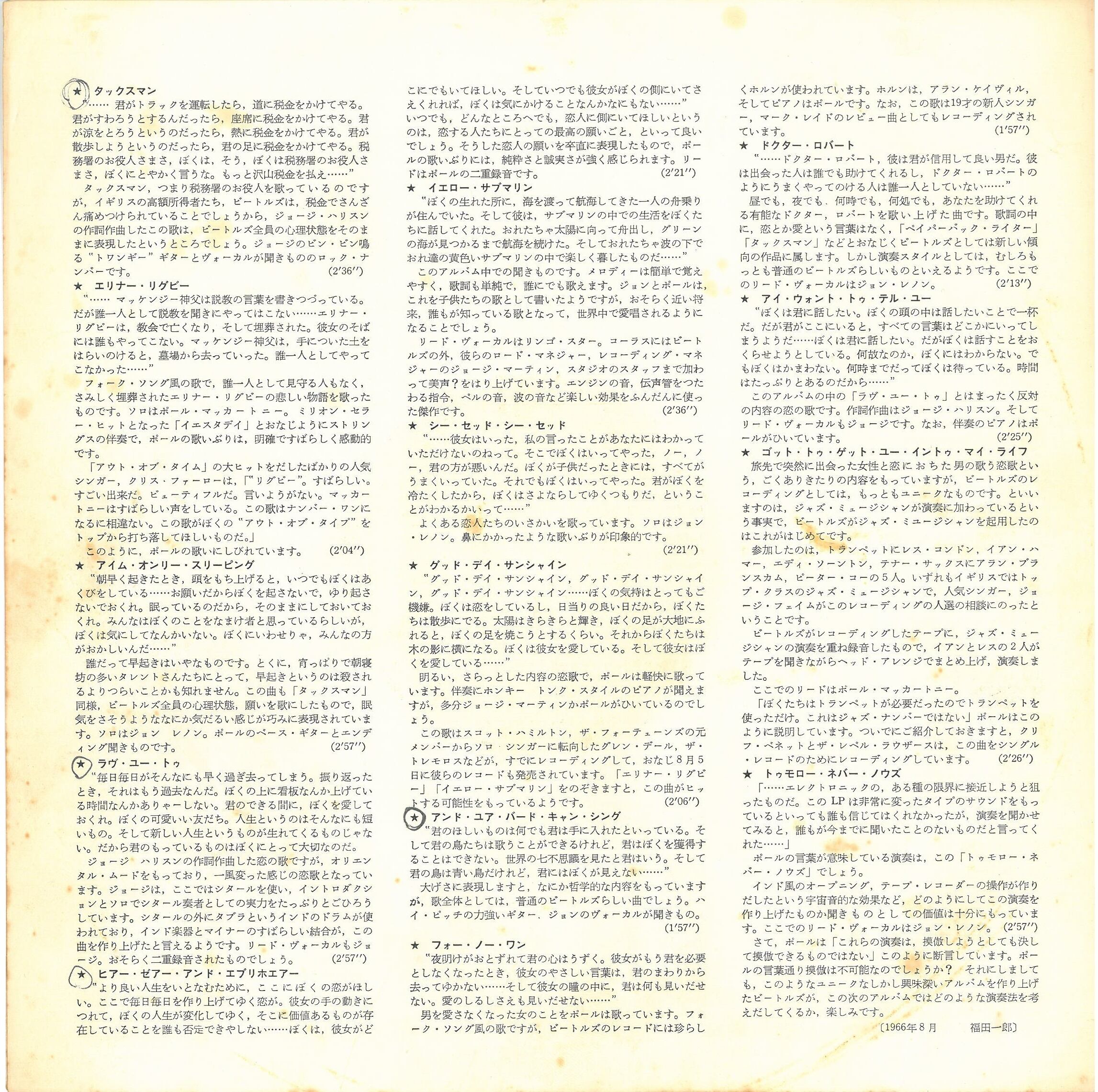 歌詞カードに経年の変色、書込み有